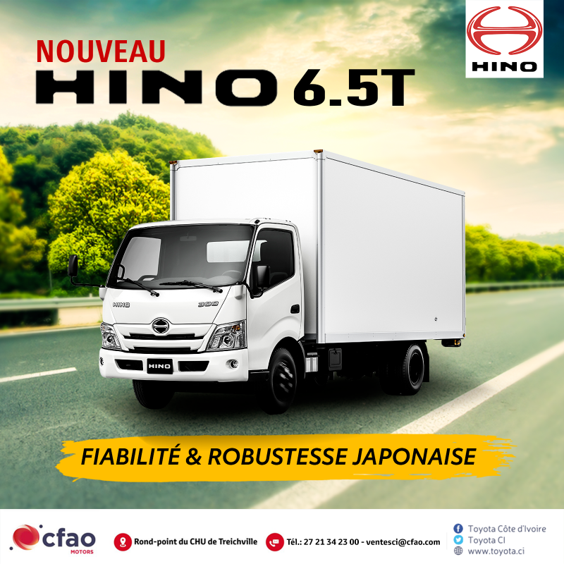 Découvrez le nouveau HINO 300 6.5 Tonnes. Un camion robuste et fiable, idéal pour tout type de Transport. Avec une faible consommation de carburant et de hautes performances, le nouveau moteur à rampe de Hino vous permet de rentabiliser rapidement.